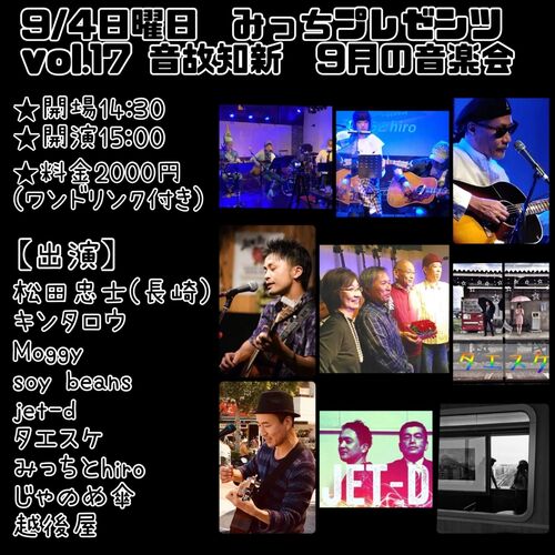 *********************************通常営業=オープンマイク通常営業 営業時間19:00~24:00 *********************************9/01木 通常営業9/02金 通常営業9/03土 通常営業9/04日 みっちPresens LIve *********************************9/05月 お休み9/0…